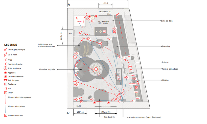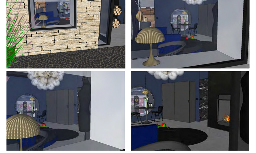 De style contemporain. Cet aménagement devait comporter un coin cuisine, salle de bain et toilettes. Il fallait également y intégrer un plancher de verre afin d'avoir une vue sur les mécanismes du moulin. Béton ciré au sol. Mise en place d'un papier peint Float Hookedonwalls nuit/cuivre. Habillage de la cheminée avec de la feuille de roche aspect ardoise. Principales marques utilisées : Tom Dixon, Flos, Knoll, &Tradition. Peinture : marque Peintagone.